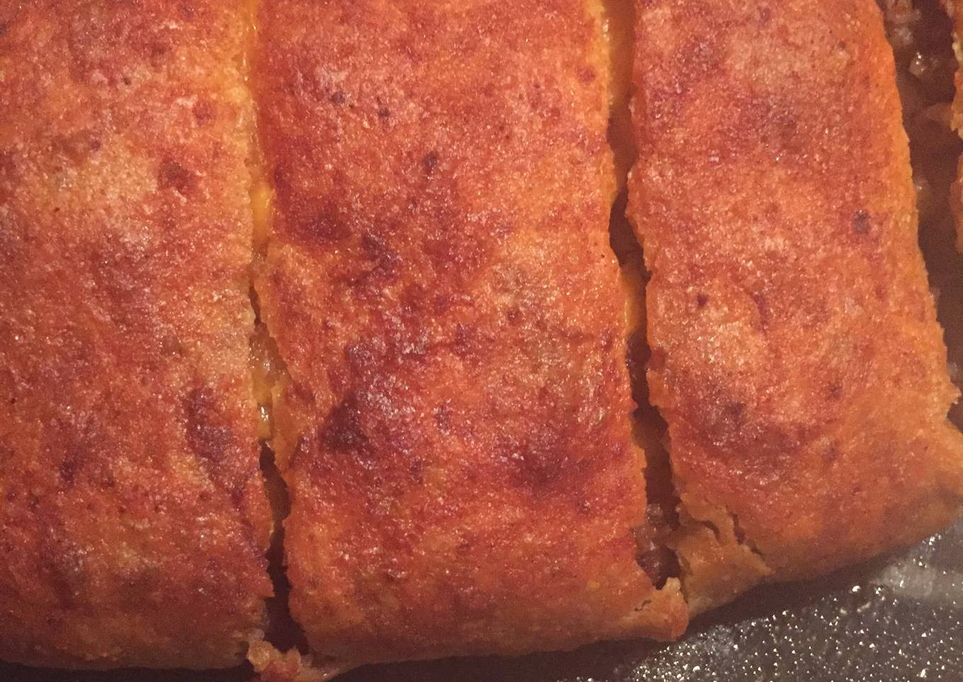 - Open canned dough and spread out evenly. Sprinkle cooked sausage in the middle of the dough.