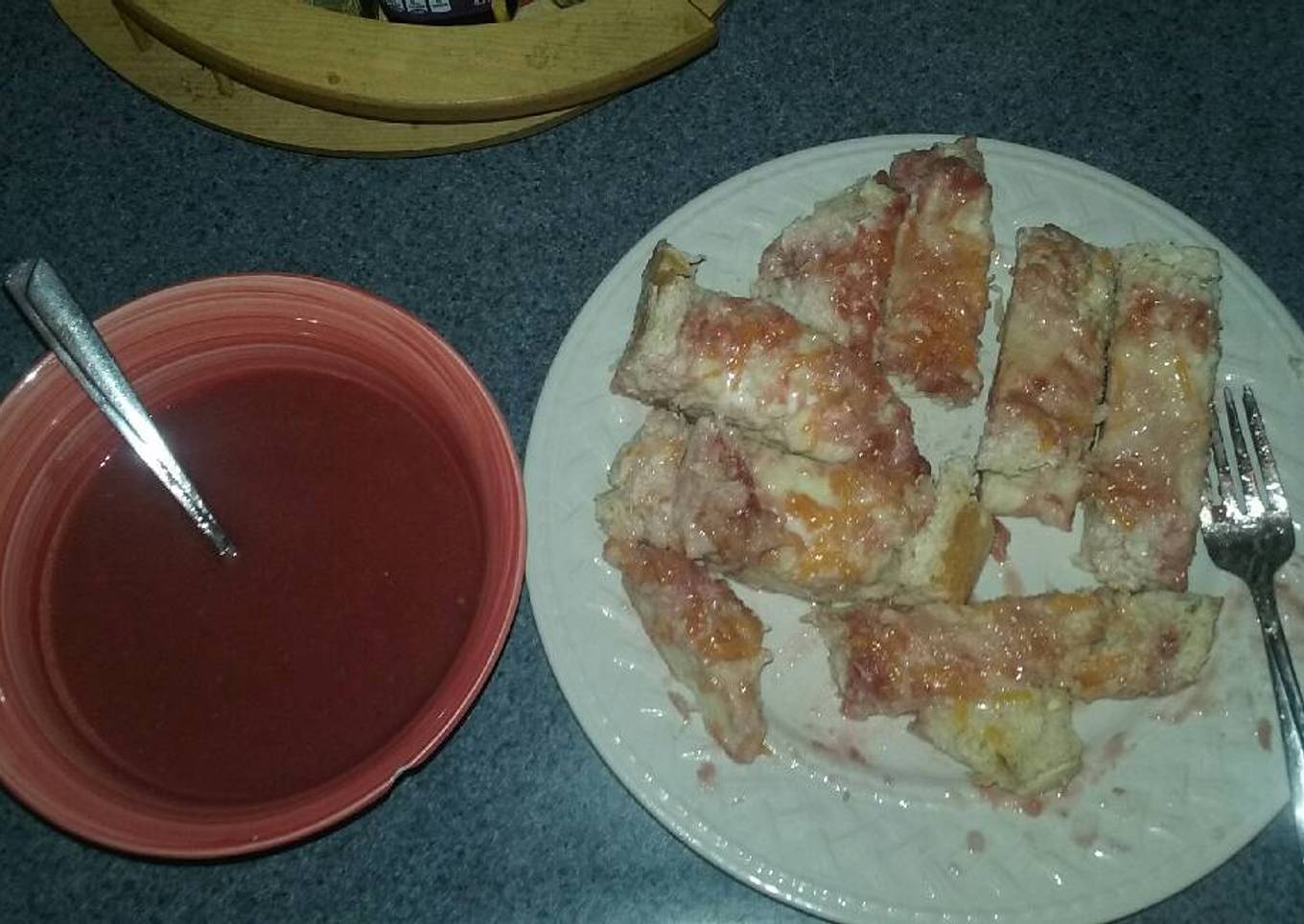- Bake in oven till cheese is melted then remove, let cool, cut into slices, and enjoy. (My kids like to use any left over "blood" as something to dip their pieces into).