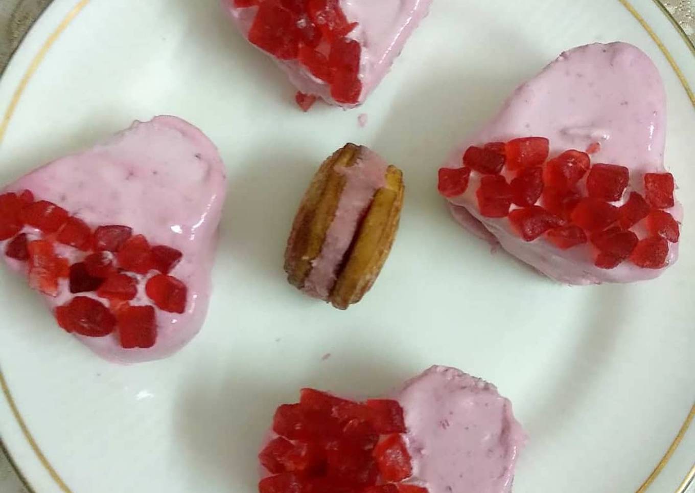 - In a bowl add cream condensed milk and 1 -2 drops red gel colour,beat until stiff peaks,spread this on bread slices,cover with another slice and cover all slices with cream, decorate with cherry,keep in fridge for 1 hour or more