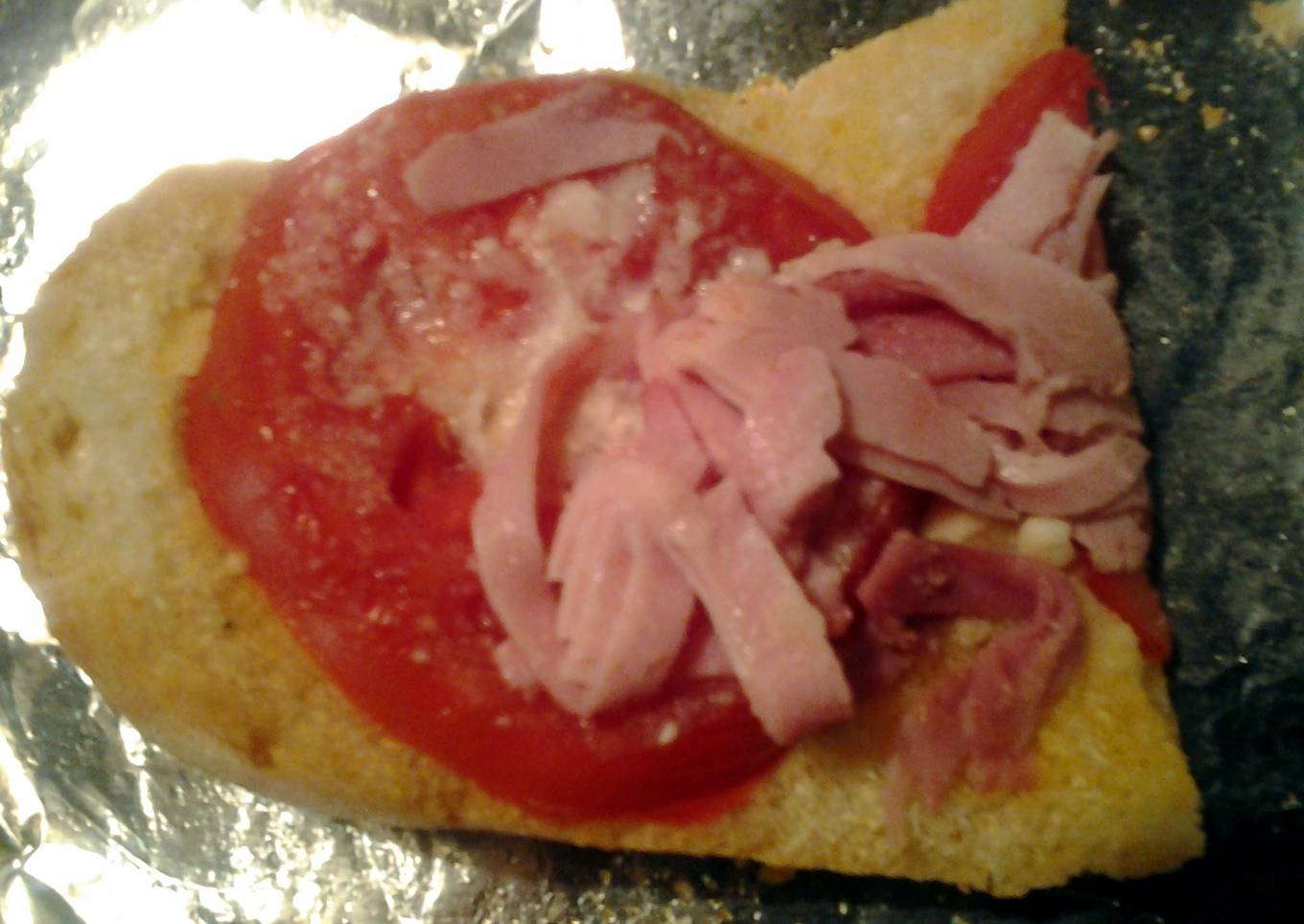 - cut down the side of bread all the way open melt butter and olive oil and add garlic powder about 1 teaspoon spread on bread on cut side slice tomatoes lay on top of buttered bread. sprinkle pepper garlic and salt. put parmesan cheese on top. roll lunch meat up cut into thin strips like cutting into a log. add to top put into oven bake till crunchy and ham pieces are slightly Carmelized