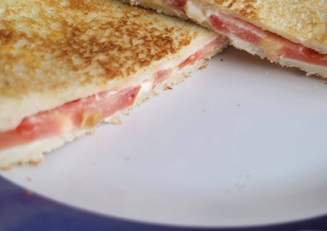 - Apply the cream cheese on the bread slices, add the tomato slices & a pinch of pepper powder. Make sandwiches & keep.