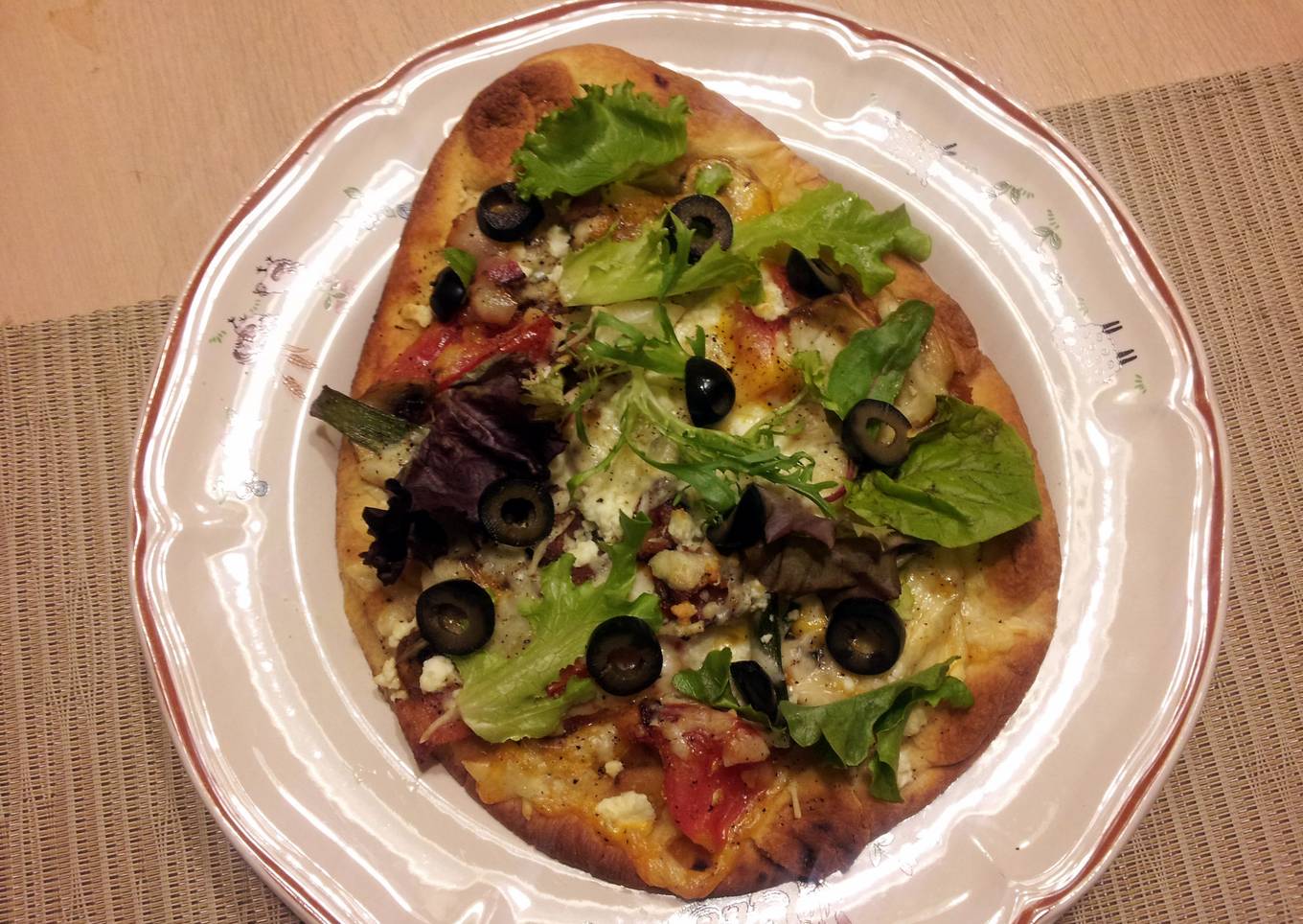 - Select your favorite toppings. I have choosen some bacon, ham, black olives, tomatoes, spinach, lettuce and feta cheese.