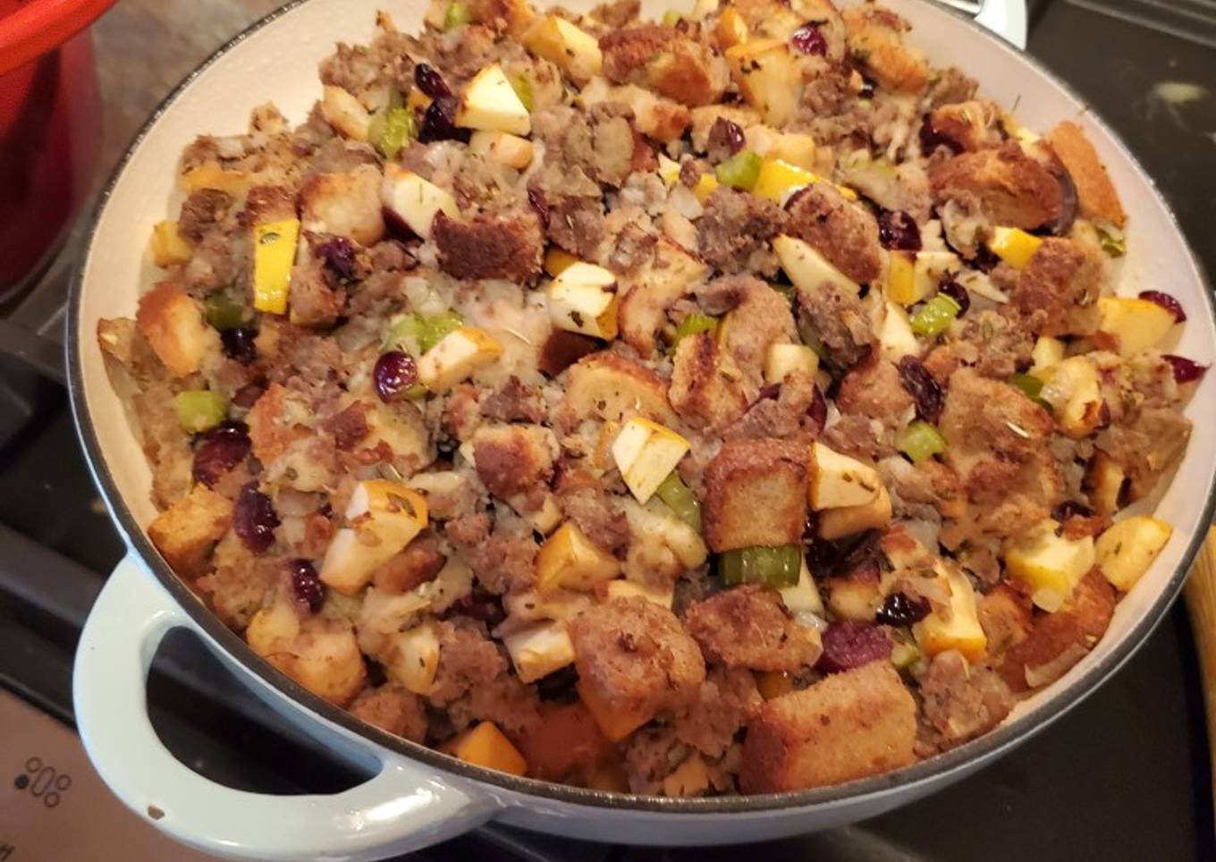 - Pour sausage mixture over bread in bowl. Mix in chopped apple, dried cranberries, parsley and liver. Drizzle with turkey stock and melted butter. Mix lightly.