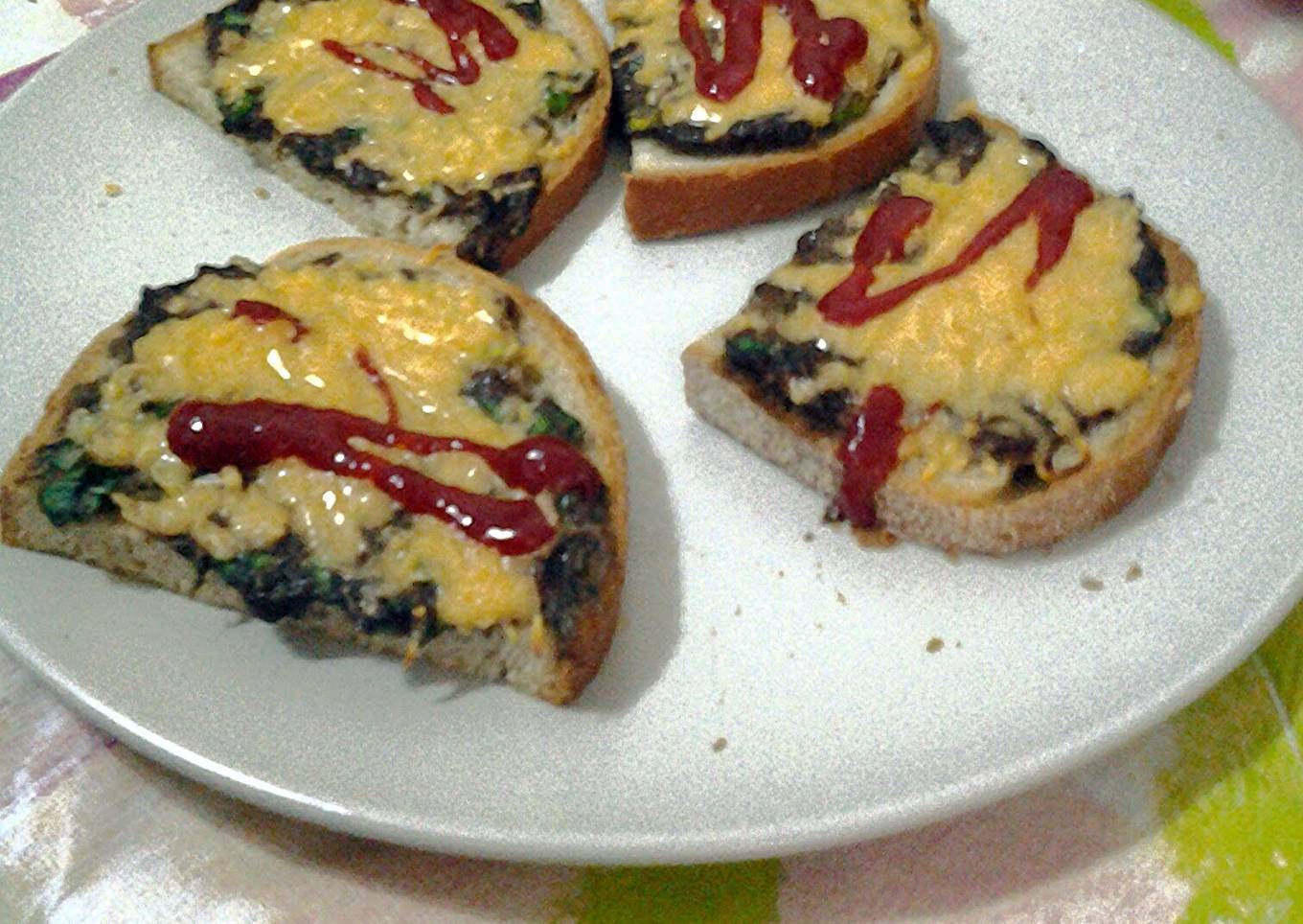 - Spread mushrooms mixture on bread, sprinkle with cheese and some ketchup