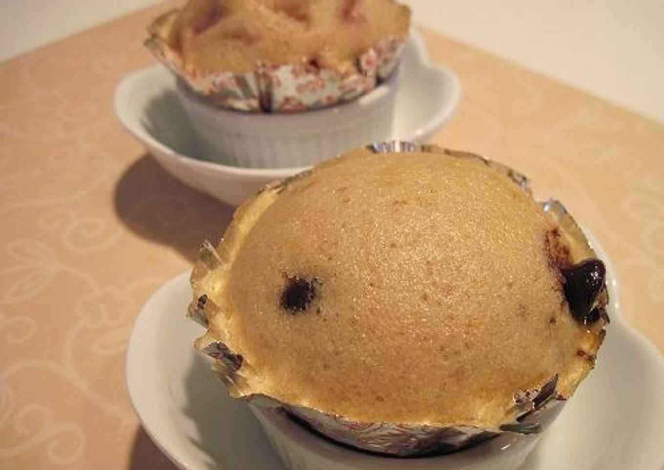 - Pour half of the mixture into each muffin cup, and add fillings of your choice. The one on the left is strawberry, and the one on the right is chocolate chip.
